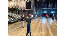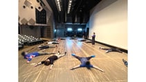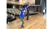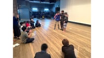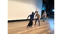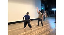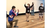パートナーのリードについていくゲームでは、ペアで互いの間を見て手を上げて、自分がリーダーになったり相手がリーダーになったり。