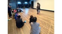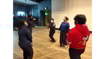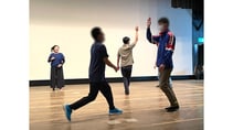 集中訓練2期生、一般の利用者数名とスタッフが参加。まずはリズムをとりながら、自己紹介。その後、手をたたいたりある人の動きを再現してリレーのように引き継いでいく活動を行いました。